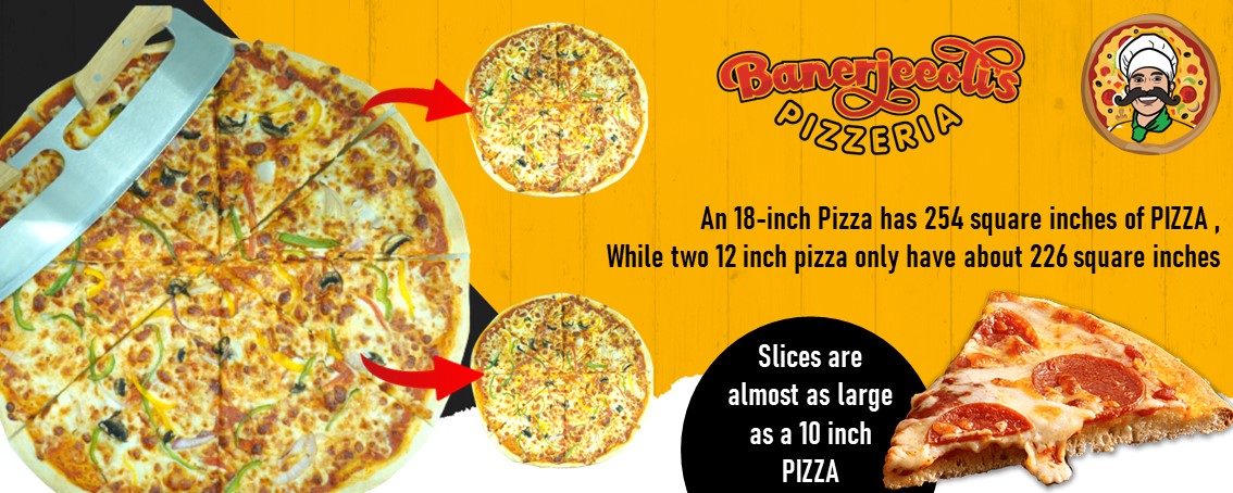 Our largest size pizza is a whopping 18 inches of heaven made manna. It is larger than 2–12-inch pizzas, which are common across India. You will need your family or friends to help you eat one. We offer personal size signature pizzas as well. There are sizes for every appetite, from your own special pizza to a cricket team needing several of the largest pizzas in West Bengal.